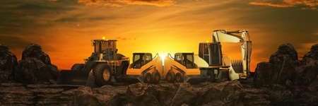 Creative artwork decoration. Construction equipment's silhouette on sunset. Loader truck and mobile crane is coming up hill. Construction concept.