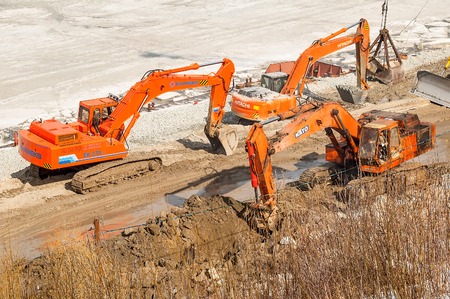 Tyumen, Russia - March 29, 2008: Excavators on pedestrian quay construction on Tura river