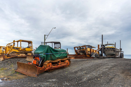 Ngawi Harbour, New Zealand - May 30, 2021: Local beached fishing fleet launched to sea by old rusty bulldozers.