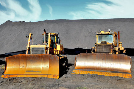 Foto two tractor on the background of the mountains of coal in Donets
