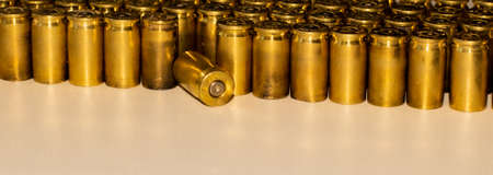 Rows of cartridge cases close-up. Above them there is space for an inscription or advertising on a white clipping background