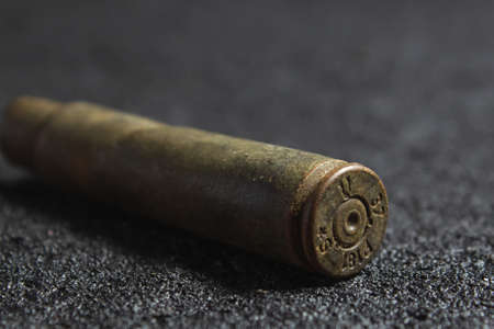 Empty rifle bullet cartridge lying on the black background.