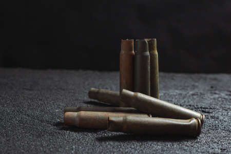 Cartridge closeup on dark gray concrete background, copy space. The concept of modern armaments, the war in Ukraine and the defense of the state.