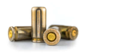 Background with bullets for a 9mm pistol, isolated on white background, ammo for a gun close-up