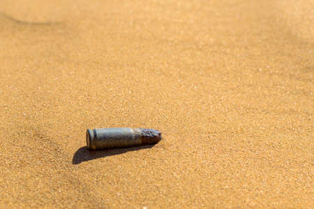 Old rusty bullet cartridge case in sand close.