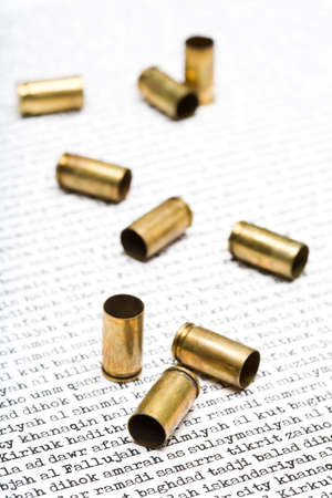 bullet shells closeup over the names of larger Iraqi cities, among others: Baghdad, Tikrit, Kirkuk, Balad, Fallujah