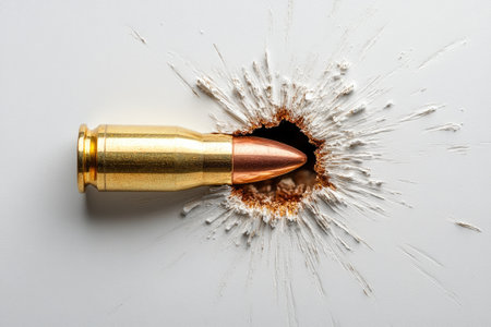 9mm cartridge stuck in a bullet hole in a white wall, suggesting an impact
