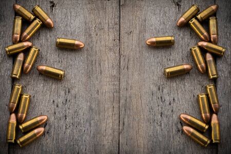 Many bullets standing in a row on a dark surface represent gun violence, crime, and military conflicts