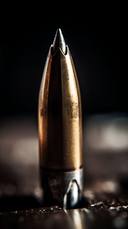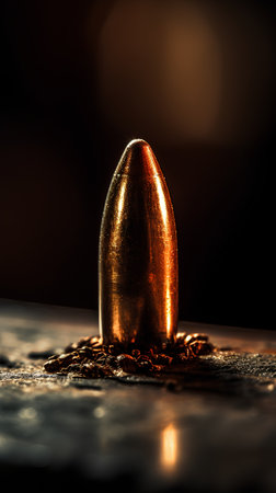 Group of copper and gold bullets reflecting on a dark background, creating a dramatic and intense atmosphere