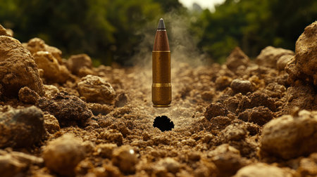 A bullet stands upright amid swirling dust, soil, and green foliage.