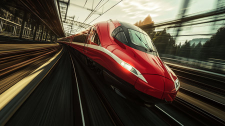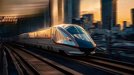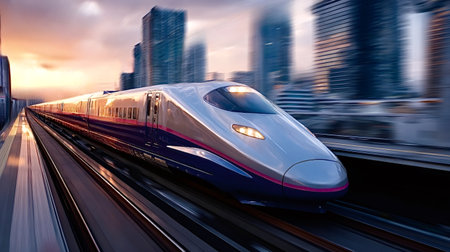Japan's shinkansen bullet train travels at high speed along tracks against a blurred city skyline during a warm golden hour, symbolizing modern efficiency and advanced transportation