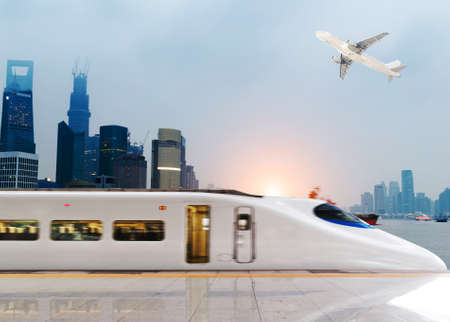 Stock Photo: very high-speed train go through the shanghai financial center .