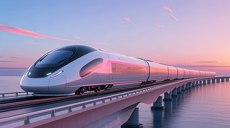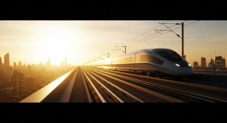 A futuristic high-speed train glides along its tracks towards a sprawling city skyline bathed in the warm glow of a setting sun. Clear details and vibrant colors enhance visual appeal.