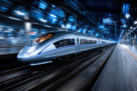 A sleek high-speed train approaches an innovative urban station with glowing lights and advanced design.