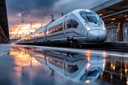 A sleek, modern high-speed train stands at a station during a vibrant sunset