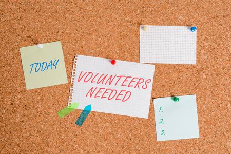 Writing note showing Volunteers Needed. Business concept for need work or help for organization without being paid Corkboard size paper thumbtack sheet billboard notice board