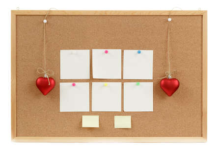 Cork notice or bulletin board with blank instant camera photo prints and several sheets of untidy torn notepaper. Space for copy.