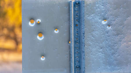 A metal target or gong for shooting sports firearms. Many holes from the shots. Background.