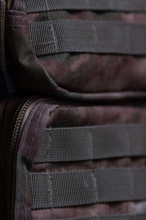 Military backpack of khaki color. Camouflage backpack. Military equipment is special, close up