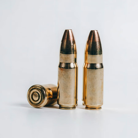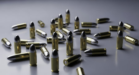 Silver tipped bullets with brass casings scattered across a light grey surface, symbolizing concepts of weaponry, defense, and conflict.