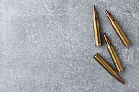 Bullets on gray background. Cartridges 7.62 caliber for assault rifle. Top view, flat lay with copy space