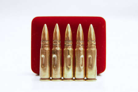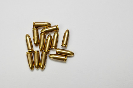 Scattered bullets on a white background. Concept of ammunition, firearm safety, military gear, crime investigation.