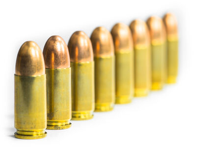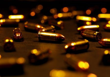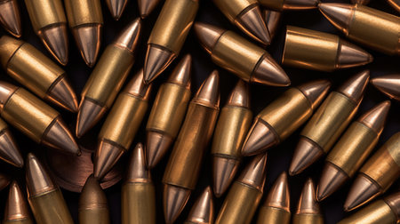 Many bullets standing in a row on a dark surface represent gun violence, crime, and military conflicts