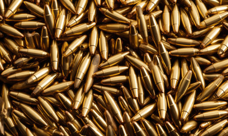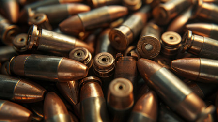 A detailed close-up showcasing a pile of shiny ammunition bullets. The image highlights the precision and design intricacies, making it ideal for content related to firearms, safety, or military.