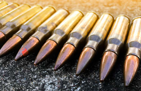 Photo of 5.56mm ammunition, machine gun bullets belt, rifle ammunition