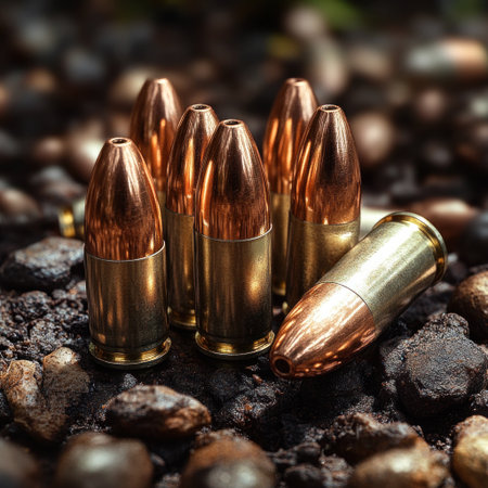 Close-up view of ammunition with shiny brass casings and copper-tipped bullets scattered on a surface, highlighting the details of modern bullet design during daylight