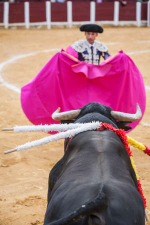 Matador and bull on tourada bullfight in Moita - Lisbon Portugal