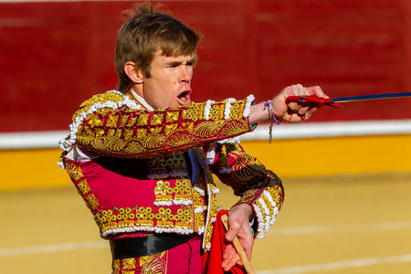 Pozoblanco, Spain - September 23, 2011: The Spanish Bullfighter Julian Lopez El Juli bullfighting with the crutch in the Bullring of Pozoblanco, Spain