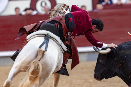 Madrid, Spain- May 14, 2022: Bullfight with the bullfighter on horseback in the Las Ventas bullring.