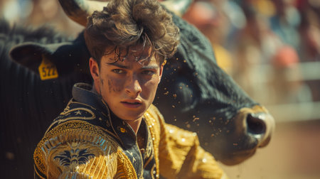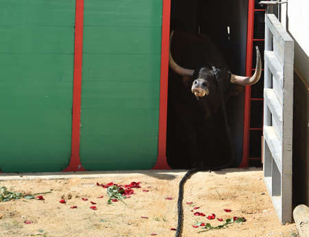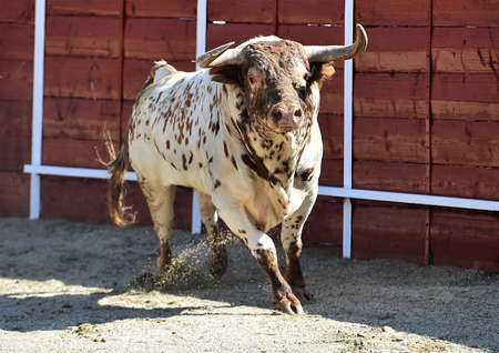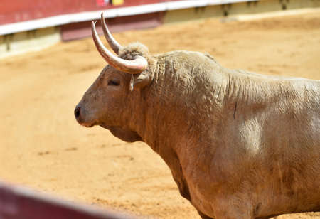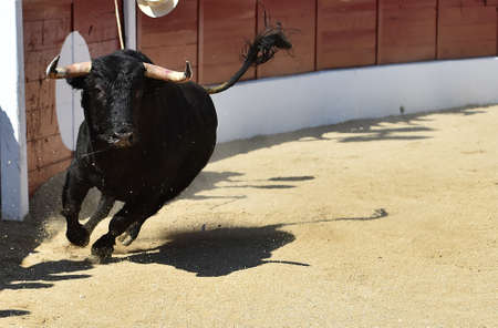 an aggressive bull with big horns on the traditional spectacle of bullfight