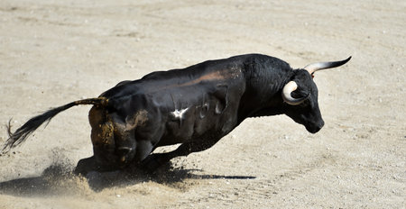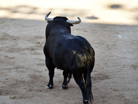 spanish black bull with big horns in a traditional spectacle of bullfight