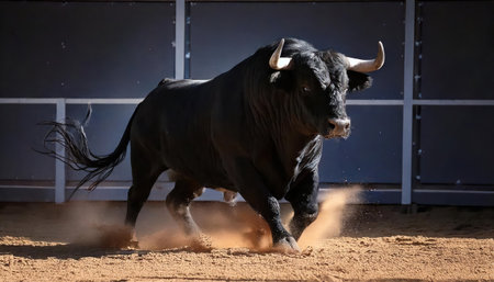 Digital image of large large bull is running toward the stage, high quality, high resolution