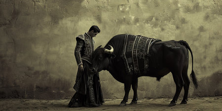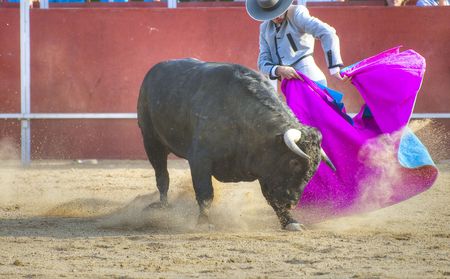 Madrid, Spain- April 30, 2022: Bullfight in San Martin de Valdeiglesias. Bullfighter with a crutch. Fighting bull. Bullfighter giving a muleta pass to the bull in a bullring.