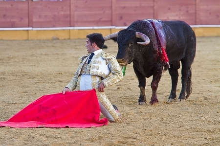 Andujar, Spain - September 4, 2010: The Spanish Bullfighter El Fandi bullfighting with the crutch in the Bullring of Ubeda, Spain