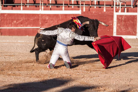 Beas de Segura, Jaen province, SPAIN - 11 october 2009 Bullfighter Alberto Lamelas bullfighting knees with your right hand gives a pass with the muleta in a very complicated position in the Bullring of Beas de segura, Jaen province, Andalusia, Spain