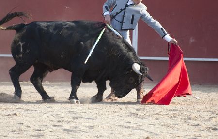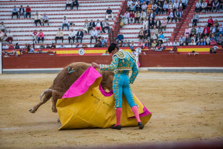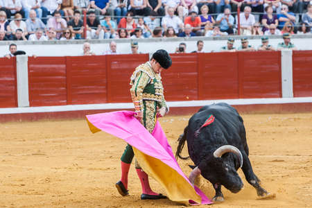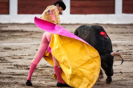 Linares, Jaen province, SPAIN - 28 august 2011 Spanish bullfighter Manuel Jesus El Cid with the capote or cape bullfighting a bull of nearly 600 kg of black ash during a bullfight held in Linares, Jaen province, Spain, 28 august 2011