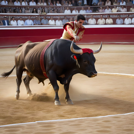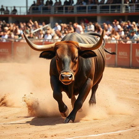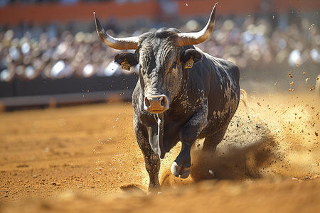 A strong black bull showcases its might as it charges in a vibrant Spanish arena filled with energy.