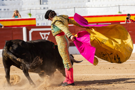 Madrid, Spain- June 19, 2022: Bullfight in the town of Villarejo de Salvanés. Bullfighter with capote in the bullring.