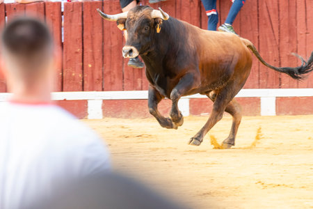 Baeza, Jaen province, SPAIN - 14 august 2014: Bull about 650 Kg galloping in the sand right when I just got out of the bullpen, in the Linares bullring, Linares, Jaen province, Andalusia, Spain