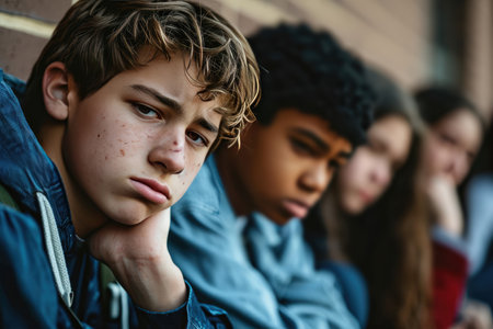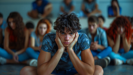 Close-up of a young man showing signs of distress, with a blurred background of peers in a group, evoking emotions of sadness and confusion.