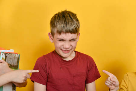 The boy is crying and does not want to study, friends with books poke fingers at him.