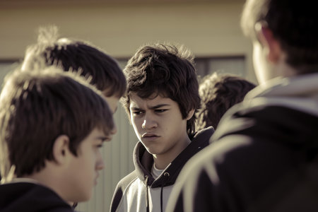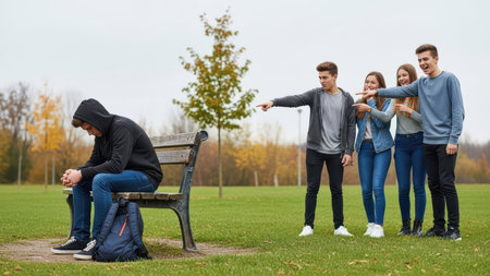 Bullying scene with diverse teen group mocking isolated male teen in park setting.