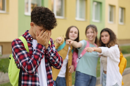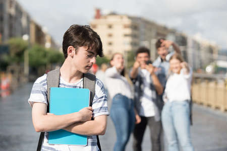 Teen problems. Group of students pointing at upset boy outdoors, selective focus