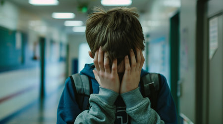 Sad unhappy teenage boy covered his face with hands standing alone in school corridor. Stress, bullying and mental problem in childhood. Generative ai.