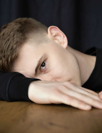 A boy with tousled hair gazes downward, surrounded by shadows that evoke an introspective and somber atmosphere, ideal for reflective or emotional the