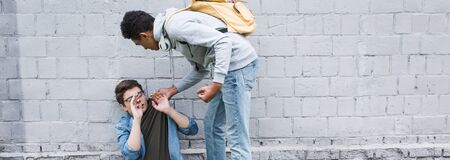 Panoramic shot of aggressive and brunette African american boy bulling frightened boy in glasses